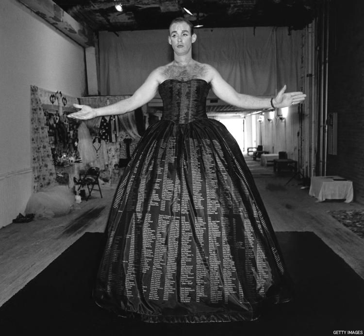 Artist and activist Hunter Reynolds models his famed Memorial Dress in 1994