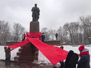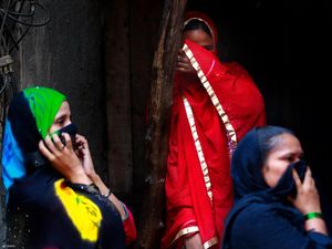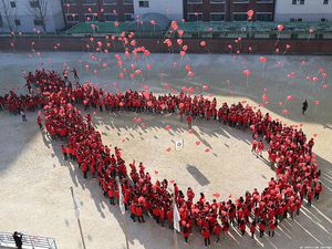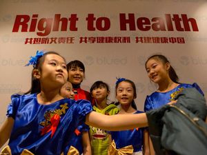 Chinese singer Wu Mochou, in red, poses for photos with young performers at an event to raise awareness ahead of World AIDS Day in Beijing, China, Tuesday, November 14, 2017. The event was hosted by Danlan Public Welfare ahead of the 30th World AIDS Day to promote the use of mobile technology to prevent the spread of HIV in the LGBT community.